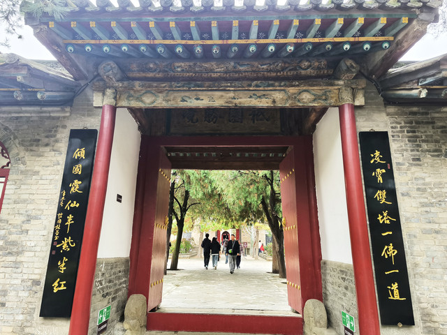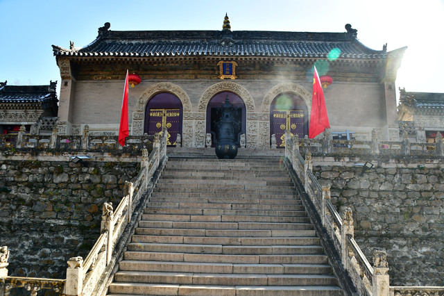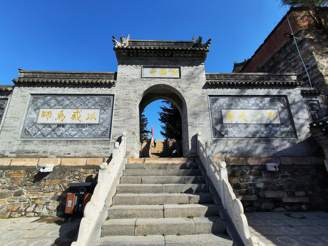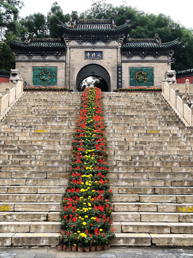 寺前有108级石阶,佛家认为,人有108种烦恼,解脱烦恼之道称为法门,每一级台阶就象征着一个法门,踏上一级台阶,就意味着解脱一种烦恼,石阶尽处就是超凡脱俗的佛土。