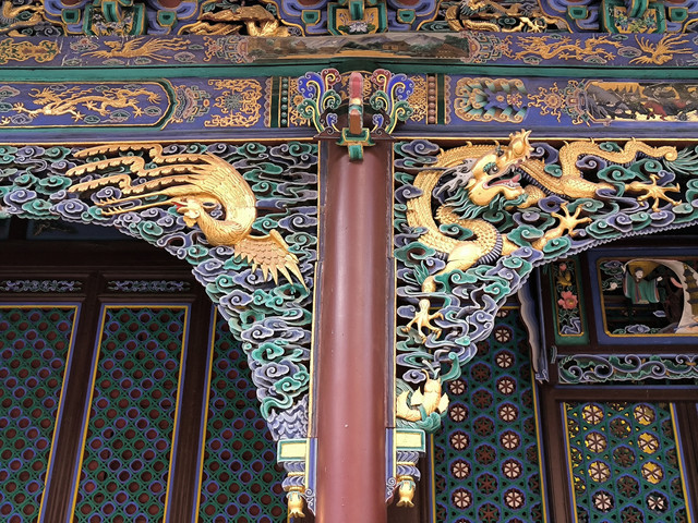 五台山显通寺铜殿,是显通寺最著名的建筑之一,为全国罕见的文物,位于显通寺的后高殿前。建于明代万历三十八年(公元1610年),共用铜10万多斤,是中国国内保存最好的铜殿之一。铜殿高八点三米,宽四点七米,深四点五米。外观两层,内为一室,四角四柱,柱础似鼓。殿内四壁铸满了佛像,号称万佛;殿中央供奉着高3尺的铜佛。铜殿隔扇的外壁,铸有各种图案和花卉鸟兽,如玉兔拜月、丹凤朝阳、二龙戏珠等,非常精致。
