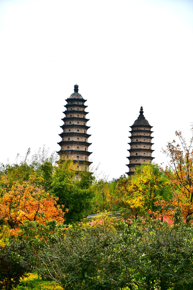 双塔寺位于太原南郊,是太原市的标志性建筑,太原市市徽上的主题图案。双塔寺原名永祚寺,因寺内筑双塔,故改名为双塔寺。双塔系明万历三十六年(公元1608)由晋穆王朱敏淳特邀护国禅师、五台山高僧妙峰法师扩建而成。寺庙依山而建,一反我国千百年来寺院建筑坐北朝南的传统习惯,坐南朝北,由前院、后院、塔院三部分组成,占地总面积3万平方米。塔院现存双塔、过殿和后殿。寺内大雄宝殿及东西配殿皆系无量殿形制,以青砖雕仿木结构建造,建筑为元、明、清代混合结构,比较完整 。三圣祠,原名观音阁,面阔三间,长16.75米,深9.7米。处在当心间顶部的砖雕藻井,被认为是双塔寺砖雕艺术和建筑艺术中的代表作。正中龛内为观音大师彩塑。塑像高2米,造型丰满,线条流畅,是为明代彩塑中的精品。双塔位于双塔寺最高之处,均在寺之东南,寺内的文峰塔先建,最初的目的是为了弥补太原城“西北高东南低”不利于发展文化的地形。舍利塔后建,名宣文塔。两座塔形制相似,砖结构,平面八角形,十三层,高54.7米,密檐式。两座砖塔一空一实,两塔相距17米,东塔内空可攀登而上,西塔内实,为仿楼阁式仿木结构,共分五层,上层塑像1尊。(门票:30元,60岁以上免票)