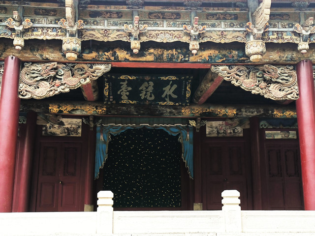 水镜台创建年代不详,明万历元年(1573)、清道光二十四年(1844)重修,集中体现了中国古代建筑殿、台、楼、阁四种风格,前部为单檐棚顶,后部是重檐歇山顶,是古时酬神演戏的戏台。戏台正中央悬挂“水镜台”匾是清乾隆年间翰林院编修晋祠人杨二酉所书,为晋祠三大名匾之一,被誉为"秀丽之笔“。