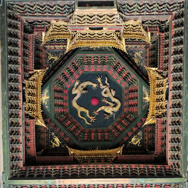 净土寺大雄宝殿内天花藻井木雕天宫楼阁为金代原物,以梁枋划为九格,分为九眼藻井,雕刻精细,极尽华美,尤其是明间正中的“八门九星之天宫楼阁”被梁思成先生称赞为“构思精巧,妙微入神,玲珑细致,超类绝伦,是国宝一绝”。是中国古代建筑中的精品。