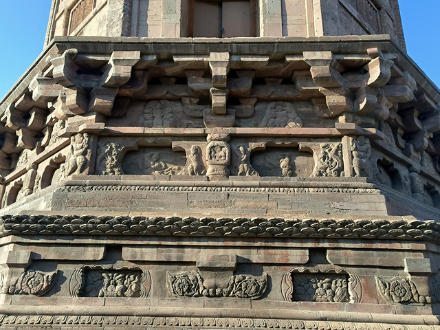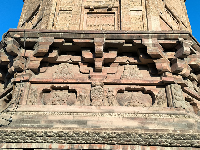塔座有上下两道堂门式束腰,座基四周雕满砖刻浮雕,总计浮雕三组,其中有舞乐人像40个,有的作长袖舞,有的作长绳舞,有的手抱琵琶,有的撑羯鼓吹羌笛,有的拍击板,姿态各异,逼真动人,对研究古代民族文化,特别是北方民族的歌舞、乐器有一定的价值。雕刻的花鸟禽兽,也各具形态,楚楚动人。