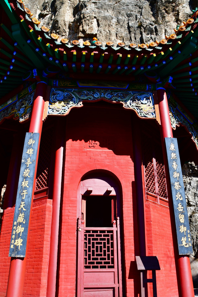 北岳庙:建于明代弘治年间(公元1501-1502年),是恒山庙中最为宏伟的一座。它位于恒山主峰大峰岭南面的石壁之下,门前有103级石阶通往前下方到达山门。北岳庙门有“贞元之殿”四个大字。门侧有长联,上联为:“恒岳万古障中原惟我圣朝归马牧羊教化己隆三百载”;下联是“文昌六星联北斗是真人才雕龙绣虎光芒雄射九重天”。北岳庙内,有北岳大帝塑像。北岳庙前廊下,有清代御祭恒山文碑20余通,这些碑文,作为历史佐证,是研究恒山的宝贵资料。殿前有元代铁铸云牌一面,殿外有石碑数十通,为研究北岳道教历史之重要史料。殿内供奉北岳大帝金身像,头戴天平冠,身披朱绫袍,端然而坐。庙内,有北岳大帝塑像。神座上方高悬康熙御书匾额「化垂悠久」。正殿东西两侧有东西耳房、更衣室、藏经楼和钟鼓楼