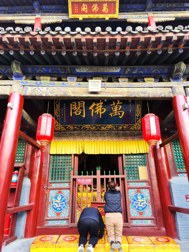 万佛阁是五爷庙的正式名称,原是塔院寺属庙,与大白塔相毗邻,是通往显通寺的又一条路径。寺庙前地势开阔,当年是大清历代皇帝朝台寝宴的行宫,俗称“皇城”。“皇城”与五爷庙之间,终年涌动着数以 万计的朝圣礼佛者。