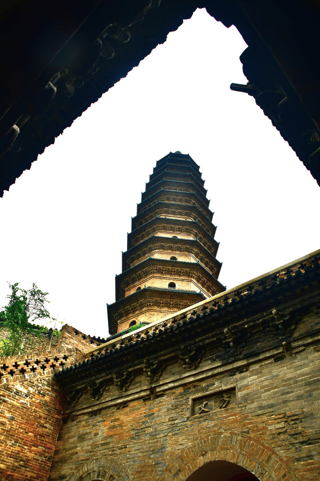 文峰塔:始建于明万历二十七年(1599),是以傅霖为首的缙绅学士为补辅太原“文运”补足而建造的风水塔。文峰塔高54.76米,13层,平面八角,为典型发的楼阁式空心砖塔。文峰塔塔身轮廓呈直线形,没有明显收分,塔身用一色青砖研磨对缝砌成,工艺精湛,古朴雅素。