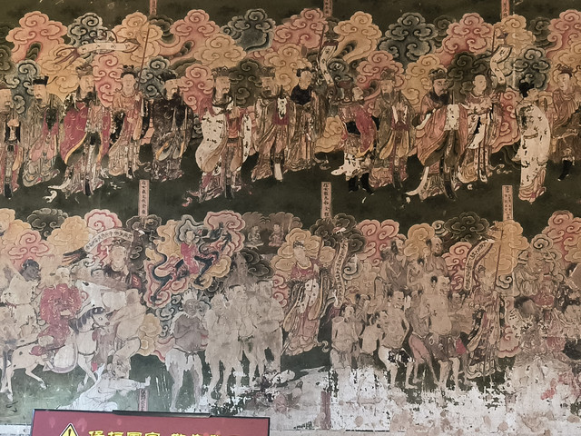 浑源永安寺位于山西省浑源县城东北鼓楼北巷,创建于金代(1115年-1234年),元明清代曾多次重修。俗称大寺,现存寺院为元代建筑,坐北向南,总面积近6500平方米。是浑源县境内现存规模最大的一座古代建筑。中轴线南端是山门,琉璃盖顶,山门五楹。寺院分前、中、后三院,(后院铁佛寺已毁)前院正中为天王殿,中院是全寺是主要部分——传法正宗殿。传法正宗殿建于元延佑二年(1315年),殿内四壁绘有元代巨幅重彩壁画。壁画内容十分丰富、所涉猎的范围极为广泛,是全国元代寺观壁画的典范之作。颇具浪漫主义色彩,大气磅礴,气势壮观,线条饱含着生命感、流动感、质感和张力。用笔更是精确、传神、果断,色彩绚丽,画面逼真。可谓“吴带当风,曹衣出水”。(门票20元,60岁以上免门票)