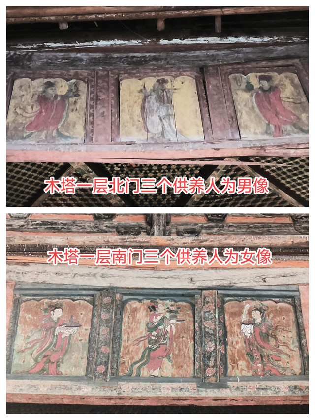 一层内槽南北门额上绘有六个供养人,南为三女像,北为三男像。据专家考证为建塔时的原作。