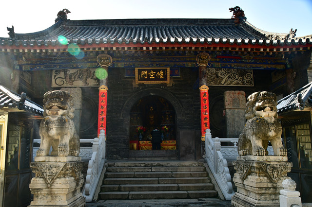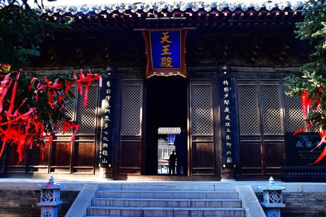 寺庙正中的空门也是这座寺庙的天王殿,面宽三间,单檐歇山顶,里面正中供的是笑哈哈的大肚弥勒佛。背面是精明强悍的石雕韦驮菩萨,殿的左右两侧是怒目凝视的四大天王。