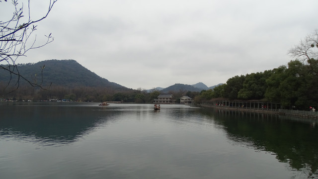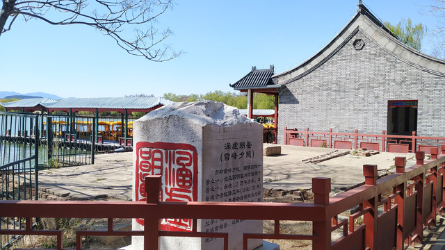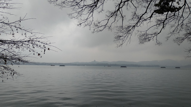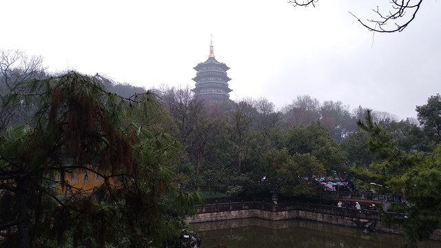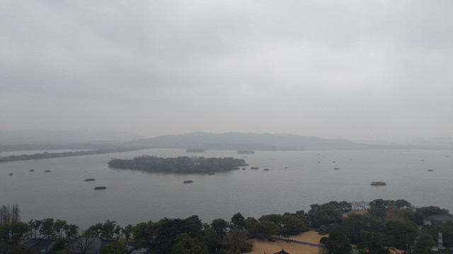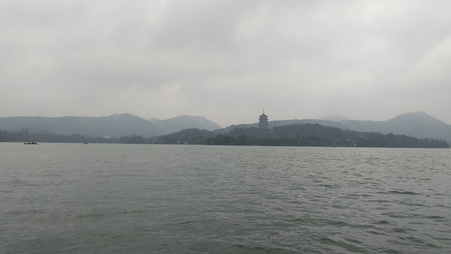 福海的中间是三个小岛,名字叫蓬莱洲,或蓬莱仙山,乃是雍正皇帝时期仿照杭州西湖湖心的小瀛洲而来。若想登岛,和西湖一样,只能乘船。那一日,游船没有营业,船只都停放在雷峰夕照这个地方。虽然叫做雷锋夕照,但是现在已经没有了塔的任何踪迹,徒留一个名称而已。而看到这个名字,就想起我曾在冬季冒雨前往杭州雷锋塔所看到的西湖。