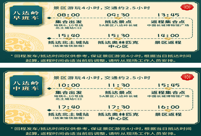 巴士达直通车采取错峰出行流水发车的形式,还有早、中双班(8点/10点)的舒适团可以选择。