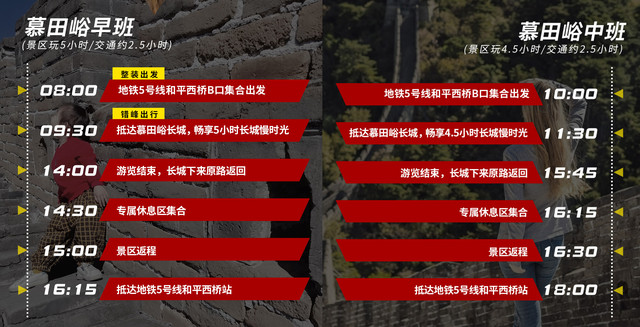 八达岭长城和慕田峪长城:两段长城景区到北京市区的距离都大约70公里,八达岭长城位于北京北部偏西,而慕田峪长城位于北京北部偏东,乘车大约都需要1.5-2小时。乘坐公交、自驾及打车都可行,但这些交通方式要么费时要么费钱,所以还是更建议乘坐巴士达景区专线直通车前往景区,是高性价比更高的选择。