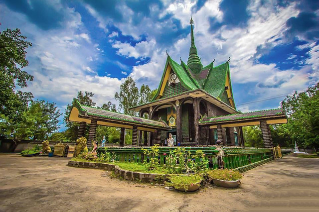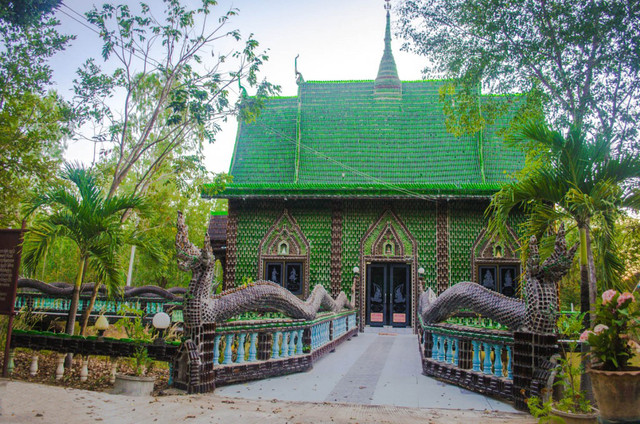 这座寺庙的构造和设计是真正的前卫,20多年来僧侣们收集了150万个啤酒瓶建造出这座匠心独具的寺庙,成为泰国热门旅游景点之一。与以往所有寺庙一样,寺庙的建筑材料通常都是闪闪发光的,但这座寺庙完全是用回收的瓶子建造而成。闪闪发光的绿色是“喜力”牌啤酒,褐色的锚线是泰国本地“象”牌啤酒。寺庙的建造有创意,功能性强,是一流的环保主义者,这是宗教信仰如何在这个世界上行善的伟大见证,向这座独特的寺庙致敬。