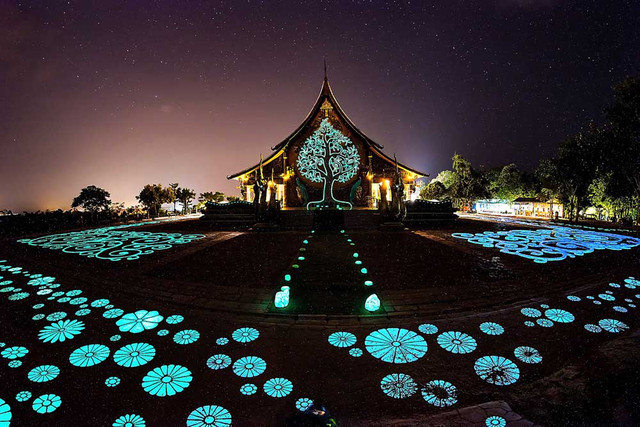 这座庙的结构有别于一般寺庙,只有一面墙,其余三面是中空的。而墙的背面是一幅巨型的菩提树壁画,绿色的生命树图腾嵌在高大的佛堂墙壁上,连着地上的图腾花纹,涂上了夜光物料,入夜便会发出绿色的光,异常美丽。寺庙坐落在悬崖上,由此可以俯瞰湄公河美景,同时也是观赏日落及星星的好地方。