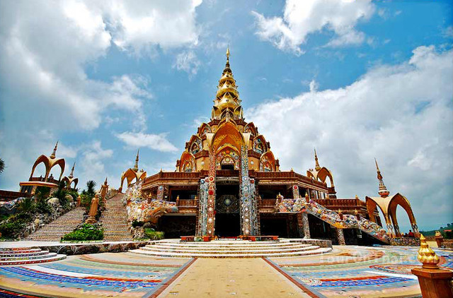 Wat Prathat Phasornkaew在泰语里意为“玻璃悬崖寺庙”, 位于碧差汶府考科县Tang Deang村附近的的山上。寺庙的主塔和周围装饰有500多万片彩色瓷砖和陶瓷,在宁静祥和的山间闪耀着美丽的光芒。五座由大至小的佛像坐落在寺庙中央,威严肃穆。