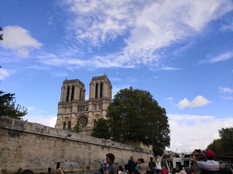 路过刚刚经历大火的巴黎圣母院,一面看着完好,另外一面在施工