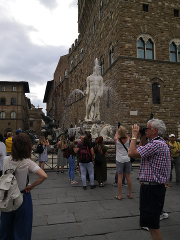 然后游览市政厅广场,这里有一座建于十三世纪的碉堡式旧宫(外观),侧翼的走廊,现在连同整个广场成为了一座露天雕塑博物馆,各种石雕和铜像作品栩栩如生,形象传神,其中人们所熟悉的米开朗琪罗的《大卫像》复制品就在此,大卫像是复制品,其他的大多数是原品,例如海王雕像等。