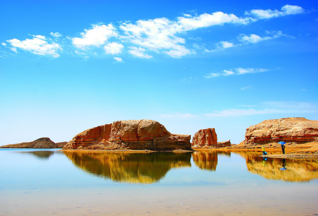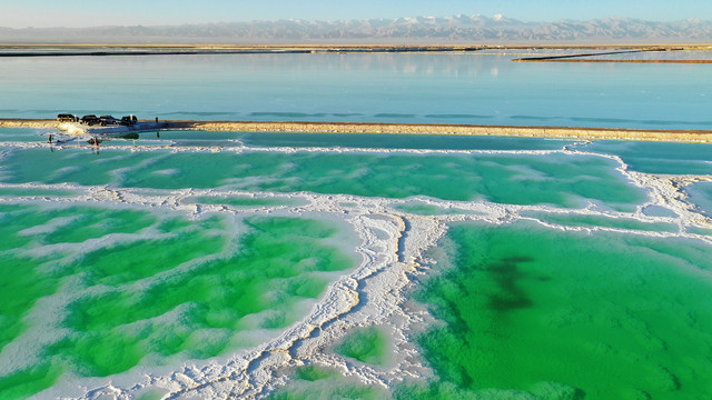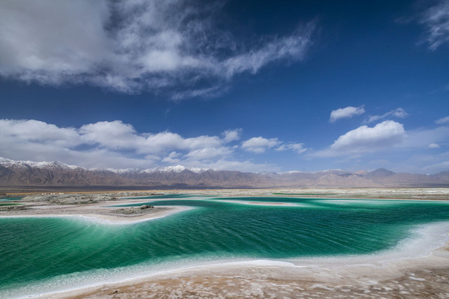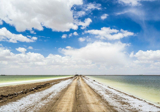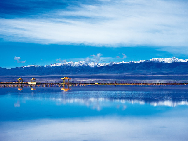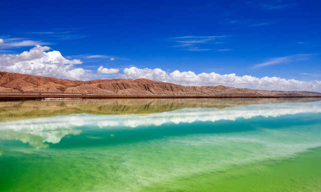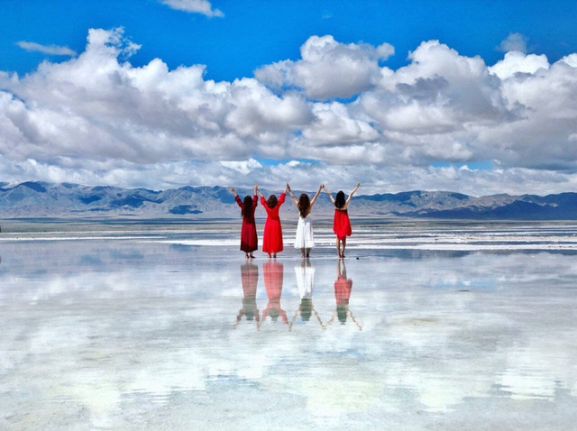 茶卡盐湖之所以能成为网红景点,也是它的自然特性决定的,湖水几乎都被抽干晒盐,深度只有10-20厘米(穿套鞋就可以进入湖中拍照),湖底又有盐分堆积形成的白色结晶,在太阳的映照下,就像一面镜子,全世界最有名的玻利维亚的天空之境乌尤尼盐沼,成因完全一致。美女们穿上鲜艳颜色的衣服,站在湖水中,倒映着远处的雪山白云,还真的是挺好看的。