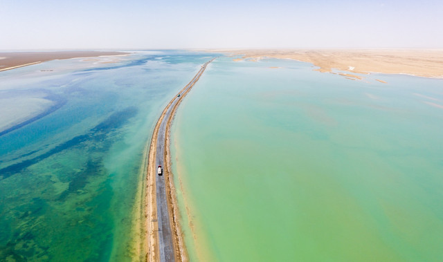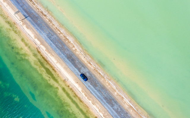 西台最吸引人的地方,在于从湖中穿过的公路两侧,是完全不同的湖水颜色,用无人机拍出来很好看。