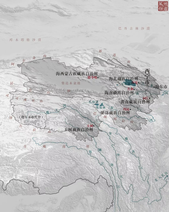 在青海山脉图上看得很清楚,青海跟周边省份正好被几座山划开:跟新疆交界的阿尔金山、跟西藏交界的唐古拉山、跟四川交界的巴颜喀拉山以及跟甘肃交界的祁连山,只有昆仑山从新疆一直延伸到青海的中部,成为中国神话中最著名的一座山。
