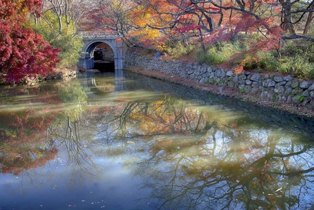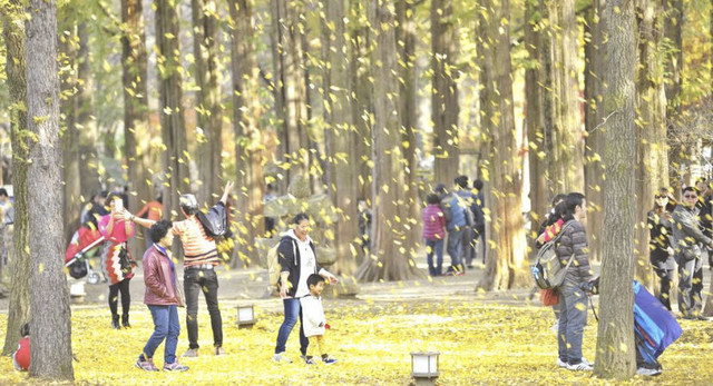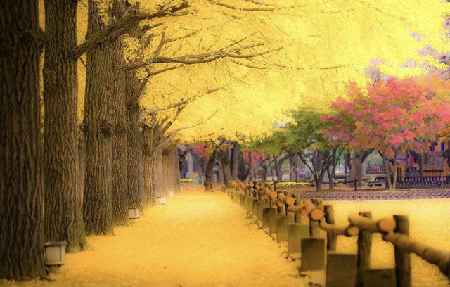 最推荐的还是南怡岛秋天的金黄和火红。每年秋天,地上就会铺满金色的银杏叶。