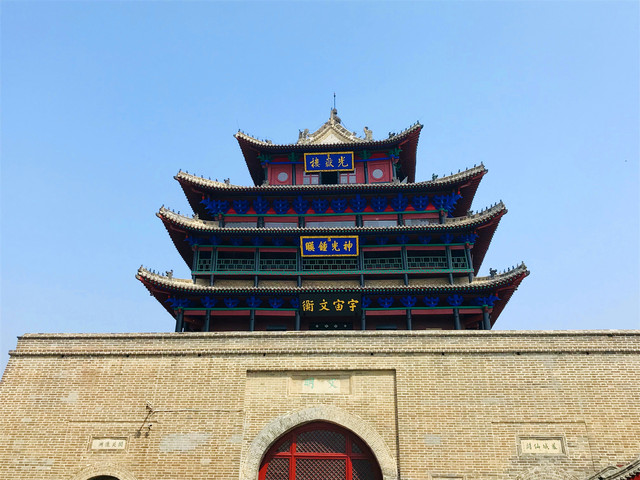 攀登至光岳楼顶举目远眺,天高地阔,无限风光尽收眼底,心旷神怡。难怪历史上许多的文人墨客都在此留下了诗赋墨宝,就连乾隆皇帝也在此写下了13首诗词。