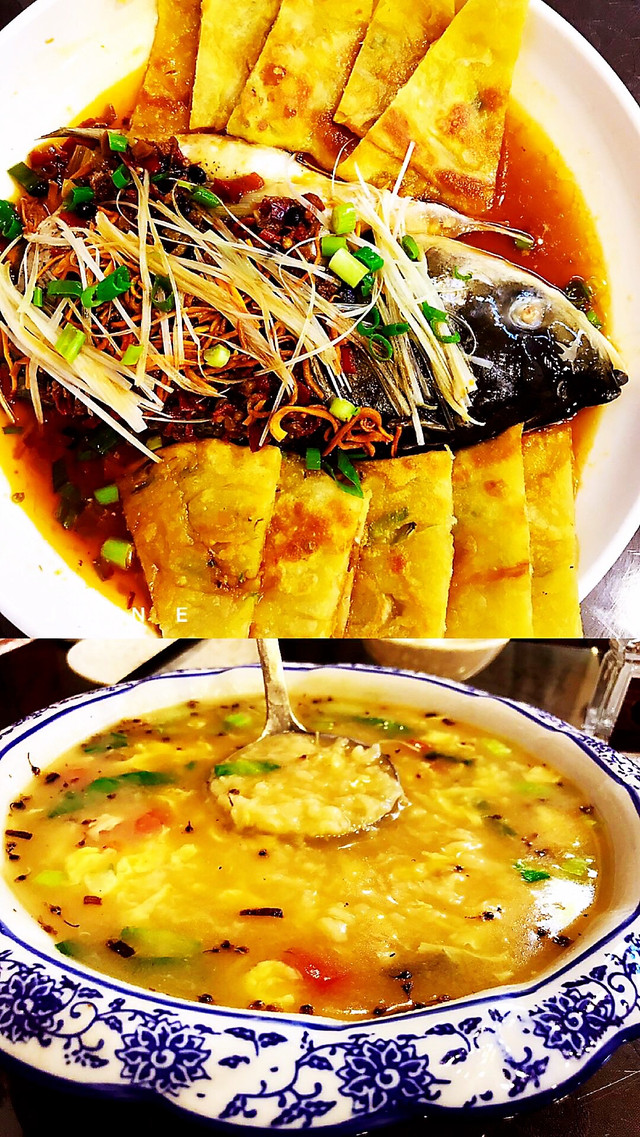 这是自驾游的第一餐,一路长途跋涉至太原 ,饥肠辘辘的我们误打误撞的进入“新茂烙饼拌汤村”。好接地气的店名,好大碟的鱼头配葱油饼,好大盆的疙瘩汤,好浓郁的 山西风味,好实诚的老板(阻止了我们再想点两个菜的想法)……一直吃到撑,两人一共才花了56元。