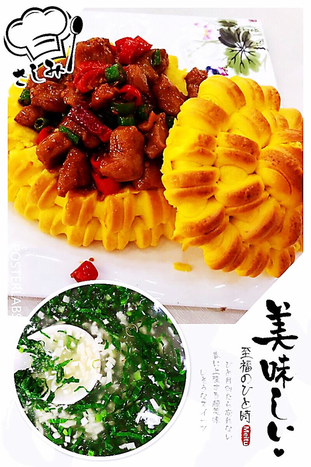 这是游过晋祠后,慕名来到“晋祠宾馆晋味斋”点的“花馍配蘑菇牛腩”。连菜带饭,色相好到不忍食用。山西 ,她的面食果然名不虚传。