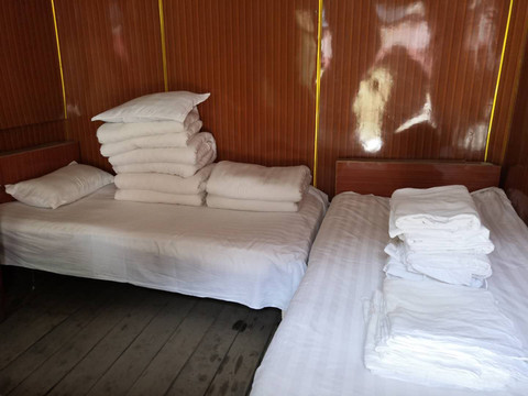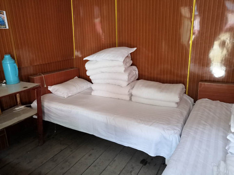林场招待所,景区唯一能住宿的就是月亮湖附近几栋白色的平房,为力邱河林业局六队招待所,能接待约30人,4个两人间,1个3人间 3个5人间 1个6人间(均为公用卫生间);住宿条件很简陋。