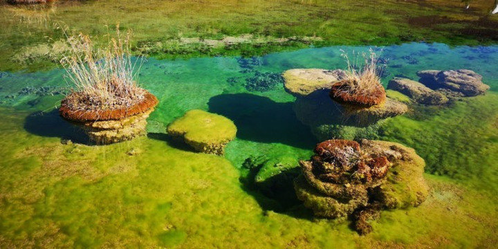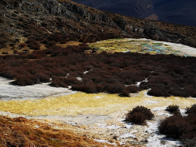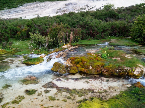 泉华滩因一种含有大量化学物质的泉水在地表产生化学沉淀而成,长达900多米,宽100余米,依山而下形成8个泉华阶地。每个阶地上有十几个大小不同、形态各异的五色彩池,水深40-70厘米,彩池里水草相依,石花点点,疑为瑶池降临人间。