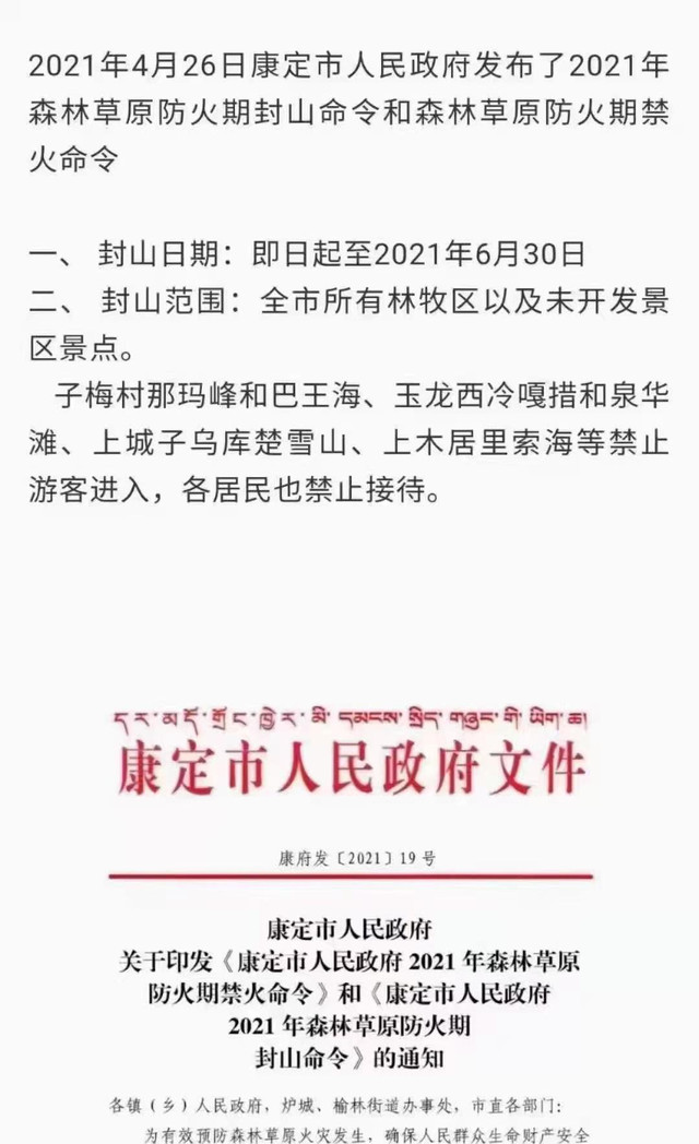2021年4月26日康定市人民政府发布了2021年森林草原防火期封山命令和森林草原防防火期禁火命令。