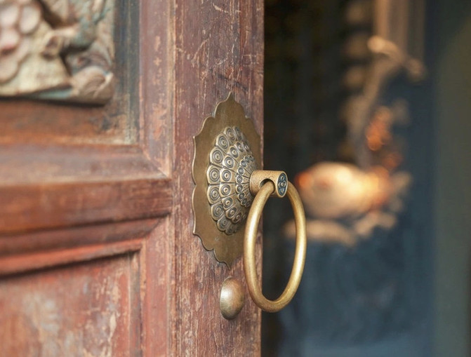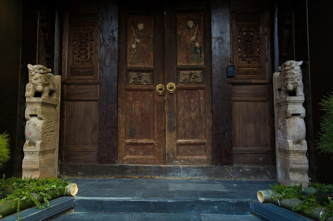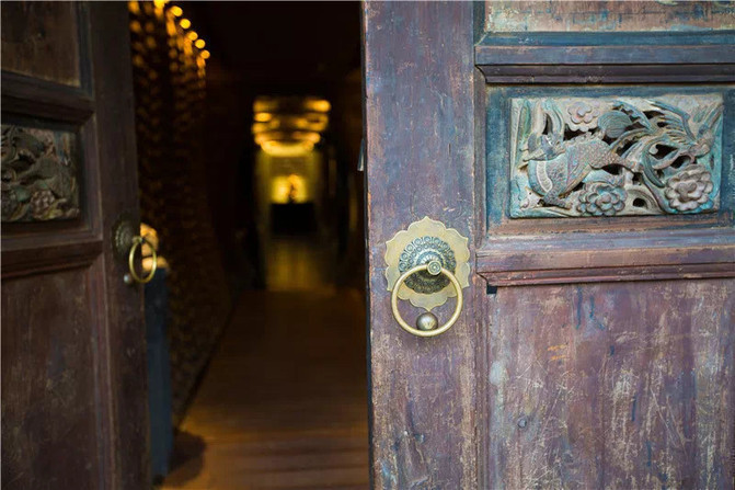 在吵闹的人群中,我们轻轻地推开这扇充满故事的们,等待管家开门的间隙,老旧的门扉也成了我们不得不看的风景,这里的大门是由红豆木所制成,没有经过任何修复,还保留着它最初的样子。中间所绘的是我们中国传统的门神形象。左边门神手持牡丹,右边门神手持爵,合起来就是加官进爵之意,据说这样的设计也是为了祝愿入住鹪鹩的客人,事业能够蒸蒸日上,节节高升,从中带领我们回到最自然的生活状态。