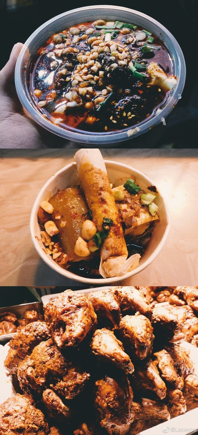 锦里凉面,糍粑,冰粉,烤肉串,蒸甜糕,还有很多叫不出名字的美食。