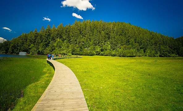 徒步到中段和后段位置,成群牛马慢慢悠悠的散步在水美草丰的牧场,百花绚烂开放,视野也慢慢变得开阔,向远眺望,只见莽莽苍苍的一片原始森林,延绵不绝向整个公园不断延伸。由于生长在高海拔地区,这些杉树的成长速度非常慢,不同于热带雨林那般复杂多样,而是略显单调统一。在徒步后段停车场附近设有属都湖观景台,立于观景台上,周围的草甸、远处的坝子连接成一块碧绿的地毯,微小的龙胆花点缀其间,成群的牛羊嬉戏于此,展现在眼前的就是一幅天人合一的绝妙图案。