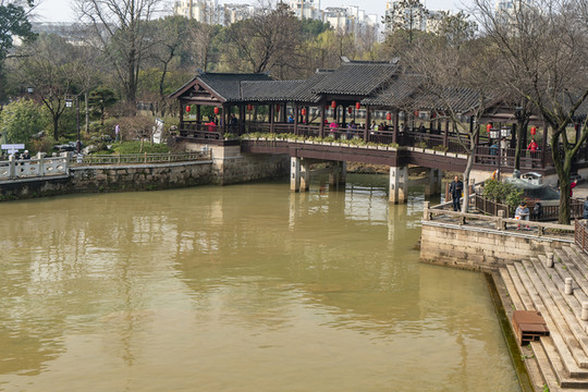 那里可见一座亭桥,桥上的亭子还挺漂亮。那是一座石板桥,看它桥板到水面的距离,皇家龙船肯定过不来,我估计也就是像苏东坡“莫便向姑苏,扁舟下五湖”的扁舟能过。