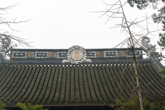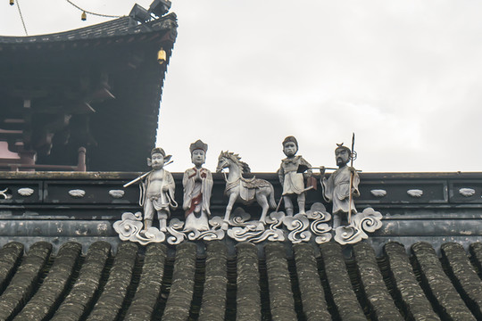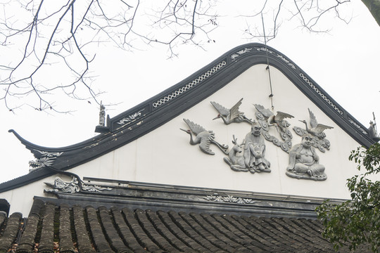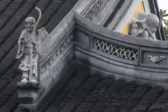 寒山丈室楼上是单檐歇山顶,看看垂脊脊端的人物塑像,还可以看见山花上的寒山拾得灰塑局部。