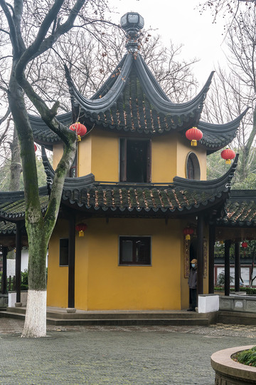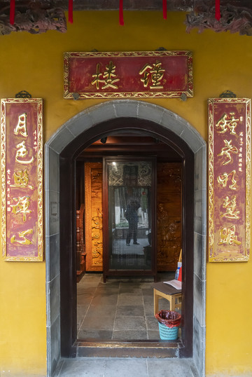 门口把门的不是武僧,而是两位保安。门上额石写着“钟楼”。门两边挂着一副联:钟声明慧眼,月色照禅心。落款是当代书法家费之雄。唐代的那口钟已在清晚期丢失,现在普遍认为是曾任日本外务大臣的大隈重信使阴谋给窃走,时间应是在日本明治维新时期,就是公元1870年前后,当时苏州一带正在太平天国末期。现在的钟楼和里面的钟是清光绪三十二年(公元1906年)所造,钟楼所在地当时是一块空地。由此说明唐代古钟最初并不在这个位置。