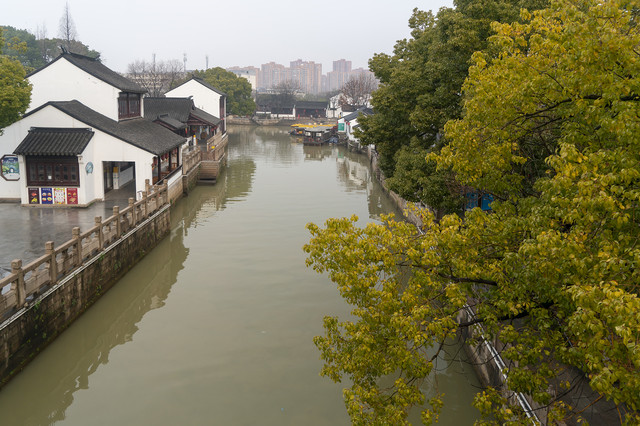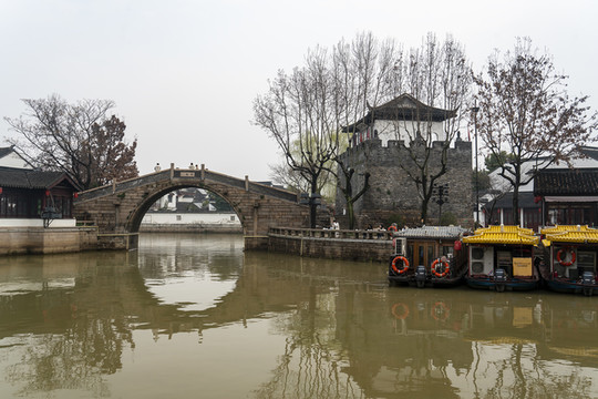 前面有一些船,那里就是当年张继泊舟处。“一抹斜阳沙觜,几点闲鸥草际,乌榜小渔舟,摇过半江秋水”。走到河湾处,就可见那座枫桥。