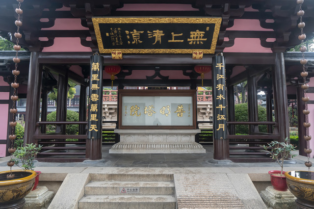 这里应该是寒山寺的圣地,所以三间敞轩门厅里立着一座卧碑,碑上是寒山寺法主和尚性空法师金字所书“普明塔院”。前面檐下挂一块“无上清凉”九龙金匾,擅长隶书的当代书法家沈定庵所书。有人说其中的“凉”字有笔画错误,其实隶书的“凉”就是这么写的。你看屋顶的那个双层斗拱抬梁,这么大的斗拱是隋唐式样。再看它的白石台基,虽然上下层中间有束腰,但这不是现在常见的须弥座,这也是仿唐式。这是想说它是模仿最初唐贞观年间的普明塔院。敞轩连接塔院內一圈唐式回廊,类似于明清的抄手游廊。