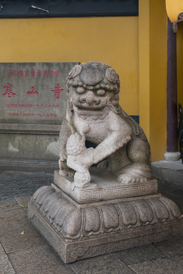 中国石狮的形象从北向南风格不同,北方石狮威严,南方石狮活泼,越往南越活泼。最威严的是北京狮,最活泼的是潮汕狮。寒山寺门前这两座石狮介于北京狮和潮汕狮之间,也是属于南狮风格。北方石狮下面多是须弥座,南方则不一定,这里的狮子下面就是莲花座。这一对石狮看上去是清代式样,不知道是不是此处原物?