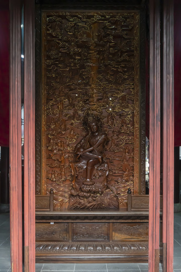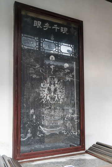 寒山寺中路上是大雄宝殿、藏经楼、普明塔院,但它们不是严格一条线。大雄宝殿前左右手有配殿,左配殿是大悲殿,就是供观音菩萨的殿呗。本来应在大雄宝殿佛龛后面的万佛山观音像,现在这座大悲殿佛龛背后,木刻浮雕,相当华丽。