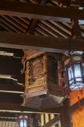 这个不是宫灯,这叫“华盖”,佛的仪仗。华盖就是帝王御辇头顶的那把伞,后来演变成仪仗之一。传说黄帝和蚩尤举办涿鹿大战时,黄帝头顶有五色云气和金枝玉叶,像花葩一样。这是上天为黄帝做的背书,叫做吉人天相。黄帝因有上天做背书,所以打败了蚩尤。后人就做了一个华盖给皇帝用,表示皇帝是天子。佛入中华后,华人给佛也做了这么一个华盖。佛像前的华盖并不是说佛乃天子,而是说佛有顶级仪仗。