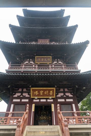 普明塔是四面塔,一层正面檐下挂赵朴初所题“普明宝塔”九龙金匾。再往上看。