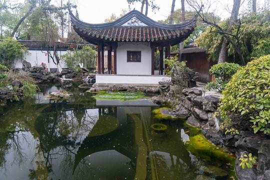 此池甚浅,难容鱼鳖。池畔却有高楼,此处故有一枫江楼,已灭三百余载。后有姑苏人移城内一宋家宅园中花篮楼于此。此宋家乃旧时苏州望族,称葑溪宋氏,祖上宋德宜曾做清康熙朝吏部尚书,宋氏族人中也出过不少有识之士和有志之士。