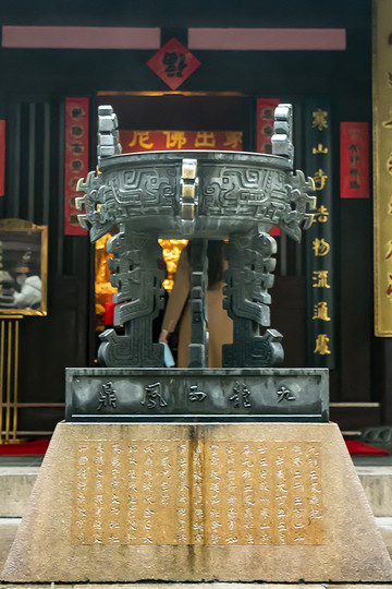 大殿前是一座白石月台,月台上有一圈白石禅杖栏杆。月台中央摆放一座青铜鼎,基座上刻着“九龙五凤鼎”,象征九五至尊。