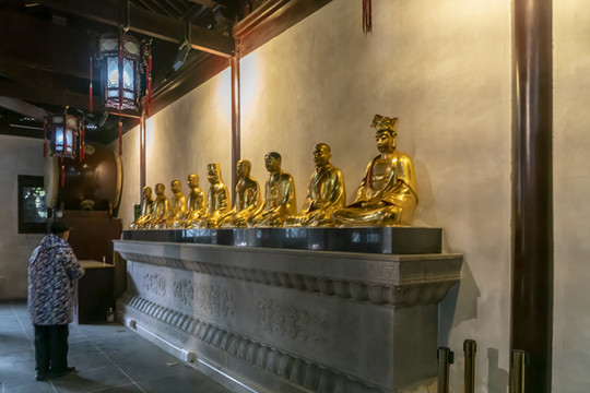 稍间山墙下青石须弥座上供着十八罗汉鎏金铜像。