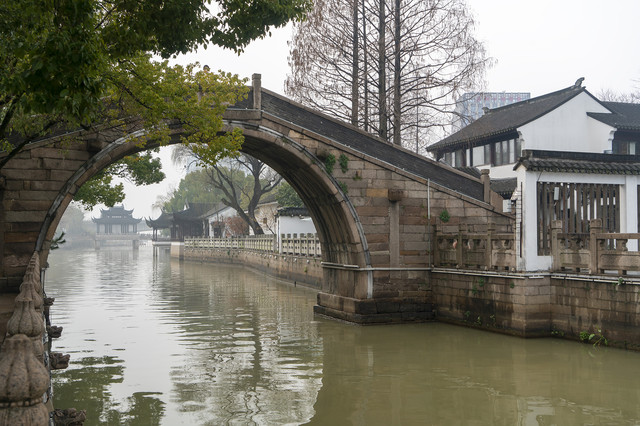 张继当年所泊枫桥早已垮塌,现在的二桥都是清晚期重建。虽然张继诗中提到江枫二桥,因为题目中仅有枫桥,所以二桥中枫桥更有名。张继诗句凄美绝伦,月落乌啼、对愁眠、夜半钟声,让人立见一位人生失意的落魄文人,还是昏夜独宿寒江孤舟。其后文人们读了此诗,便就都来这里看看,那个唐小杜十三郎也曾来登上枫桥,并吟:长洲苑外草萧萧,却算游程岁月遥。唯有别时今不忘,暮烟秋雨过枫桥。你听,也是悲调吧?