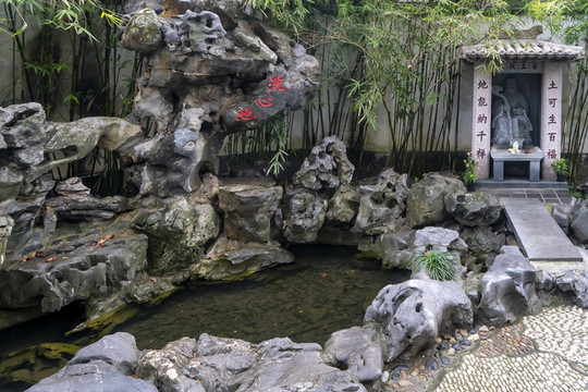 这些池边都有奇石藤蔓修竹秀亭,以便高僧矮徒们修身养性。为免地方豪绅索财掠物,池边墙下建有土地神龛护卫。虽佛法无边,然其仆人们仍需小神保佑。