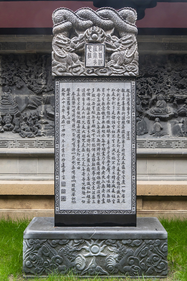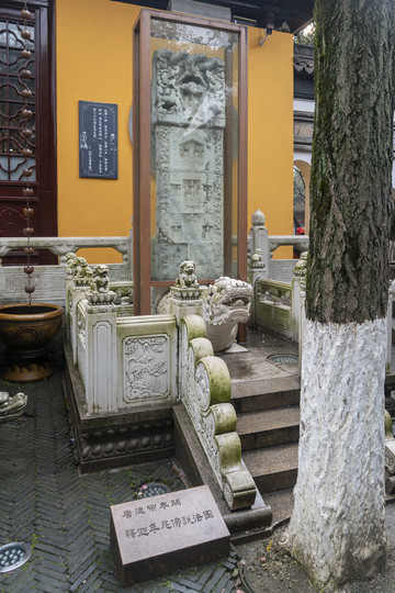 碑是唐代老碑,座是新作。地上石牌说碑是唐德宗年间物件,唐德宗李适(念李扩)死于贞元二十一年(公元805年),那这块碑就有一千二百多年历史了。通常寺院中,大雄宝殿前的这个位置是树立功德碑的。寒山寺这里的碑不是记录寺院建、修功德的,而是若干层浮雕,佛祖说法图。张继过寒山寺作《枫桥夜泊》是唐至德年间,就说是至德二年(公元757年)吧。那就是说,张继诗炒热寒山寺后,寺名大噪,增置了产业。这座碑就是那个时候新增的,还把功德碑的位置给占了。