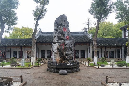 这块石头是黑色的,表明它其实不是太湖石,而是安徽灵璧石,属于山中大理石。灵璧石是中国四大观赏石之一,除了太湖石和灵璧石,还有马鞍山昆山石和广东英德石。寒山寺的这块灵璧石是前些年从安徽灵璧搜来,有七米高,比留园的太湖石冠云峰还高。