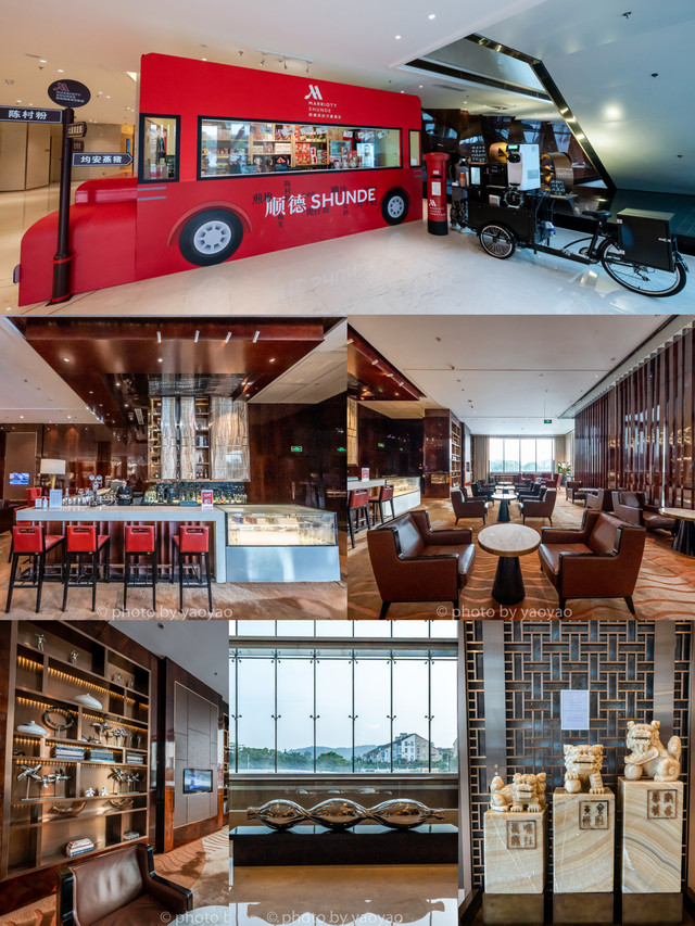 大堂:酒店一楼有个超大的红色汽车模型KT板,里面所展示的是佛山的相关文化,如佛山醒狮、黄飞鸿手办、明信片等,还有当地的特产可以购买。二楼是大堂,宽敞典雅的设计风格,在大堂还可以看木窗、狮子雕像等岭富有岭南文化特色元素。